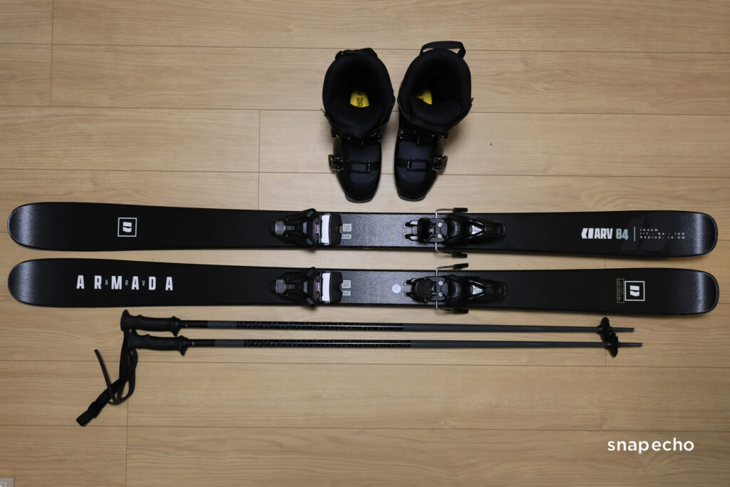 板は店員からお勧めされたアルマダというメーカーのエントリーモデル。もともとネットで調べているときに知ったメーカーでフリースキーを始めるならおすすめとのこと。価格も比較的お手頃でした。ビンディングは正直詳しくないので同じメーカーなら問題ないだろうと思い、アルマダのビンディングを選択しました。